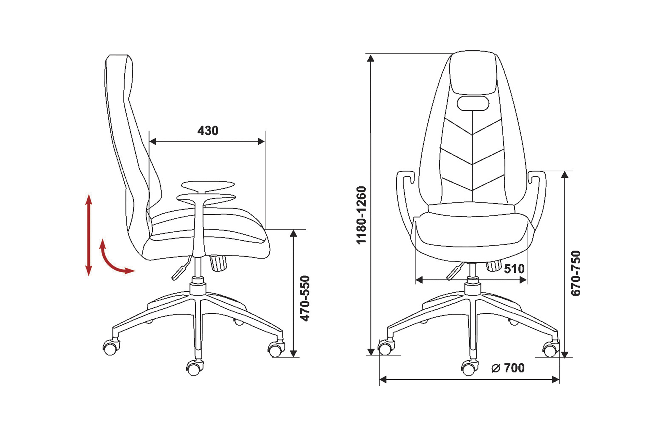 Диаметр колес - 6 см. Высота сиденья - 55 см. Высота с подлокотниками - 75 см. Ширина сиденья - 51 см. Глубина сиденья - 43 см. Материал колес - с накладкой PU. Синхромеханизм качания с регулировкой под вес и фиксацией в нескольких положениях. Подлокотники металлические (полированный алюминий) с мягкими кожаными накладками. Крестовина металлическая (полированный алюминий)